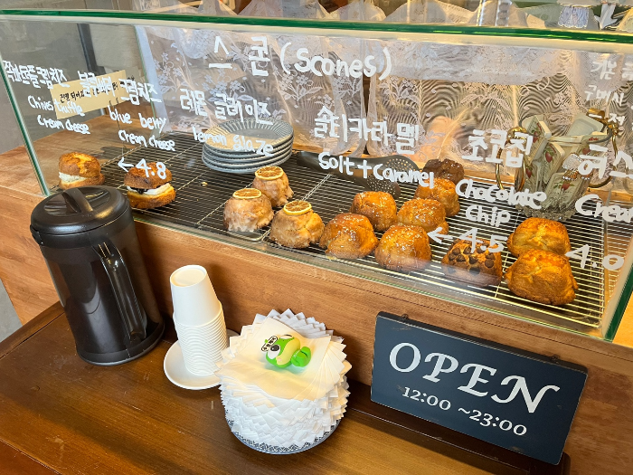 베이커리는 거의 스콘으로 구성되어 있었어요. 그래서 종류도 정말 다양했고 맛있어 보였어요. 저녁 먹기 전에 잠시 들린 거라 디저트를 못 먹어본 게 너무 아쉬웠습니다.