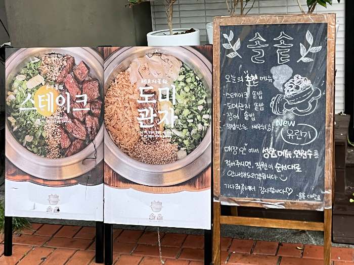솔솥의 입구에는 광고하는 입간판이 많더라고요. 맛있게 생긴 스테이크. 도미 관자 솥밥 사진이 보이네요.