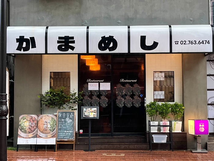 간판에는 일본어로 카마메시 라고 적혀있는데요. 카마메시란 일본식 솥밥으로 작은 솥에 닭고기, 생선, 조개, 야채 등을 넣고 술과 간장으로 맛을 내는 음식이라고 하네요!